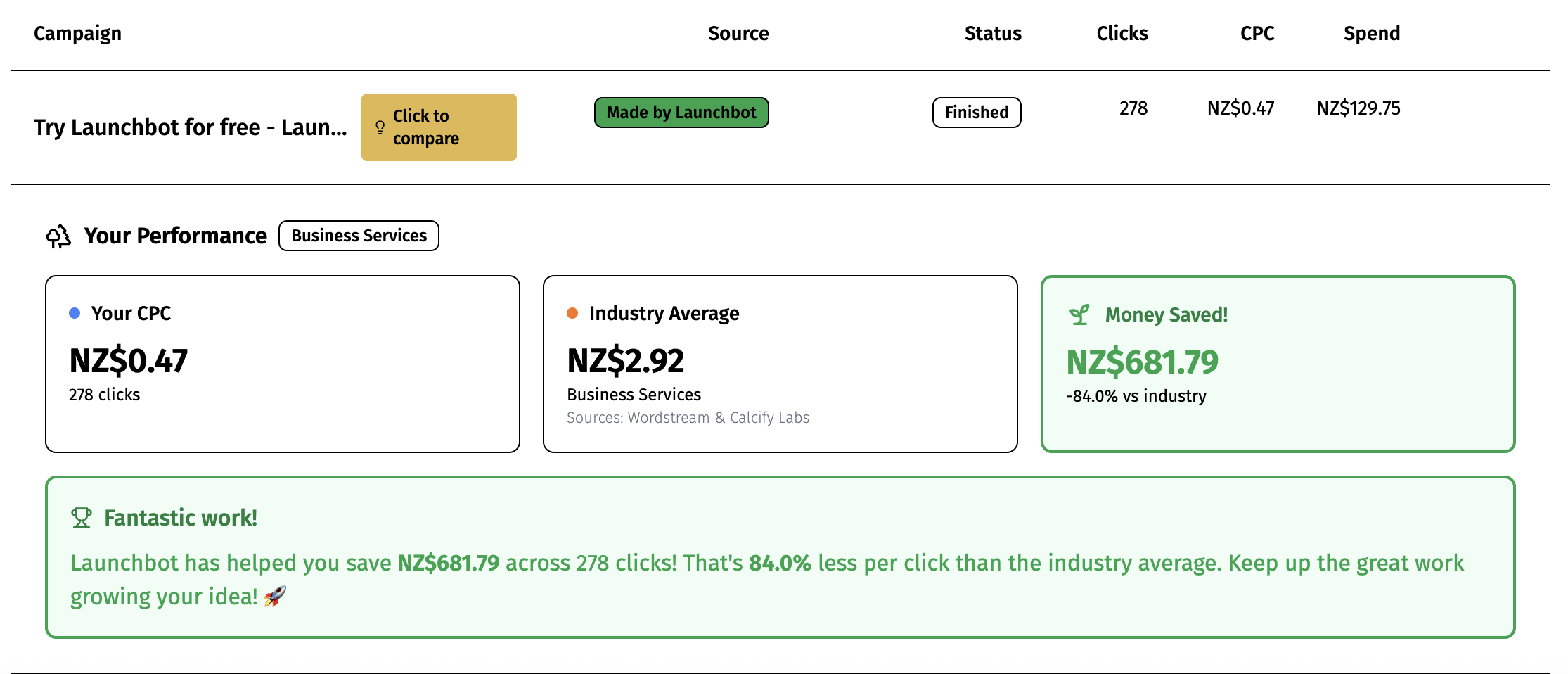 On average, Ads Launch users have been getting 100 website visitors for $39 using Launchbot, as opposed to $220 alone. And we're just warming up!