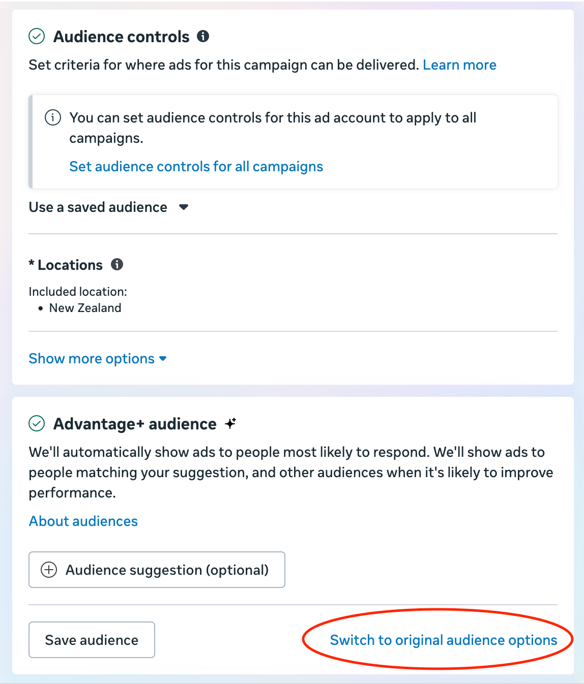 - Under Audience Controls, click Switch to Original Audience Options > Use Original Audience.