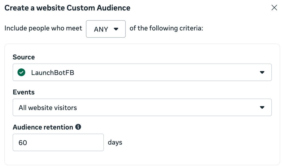 7. These are the people you will send your Remarketing ads to. Set the Source to the name of your Pixel (there's probably only one option, pick that). Keep Events as All website visitors. Set Audience retention to 60 days. This means, "Remarket to every person who came to my website over the past 60 days".
