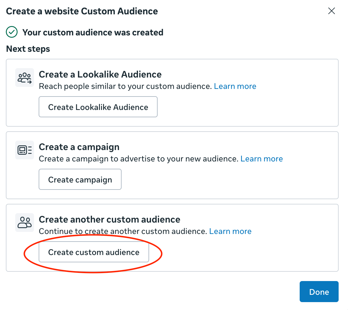 - In the "Your custom audience was created" screen, click Create another custom audience > Create custom audience. If you've already exited this screen, just go back to step 5.