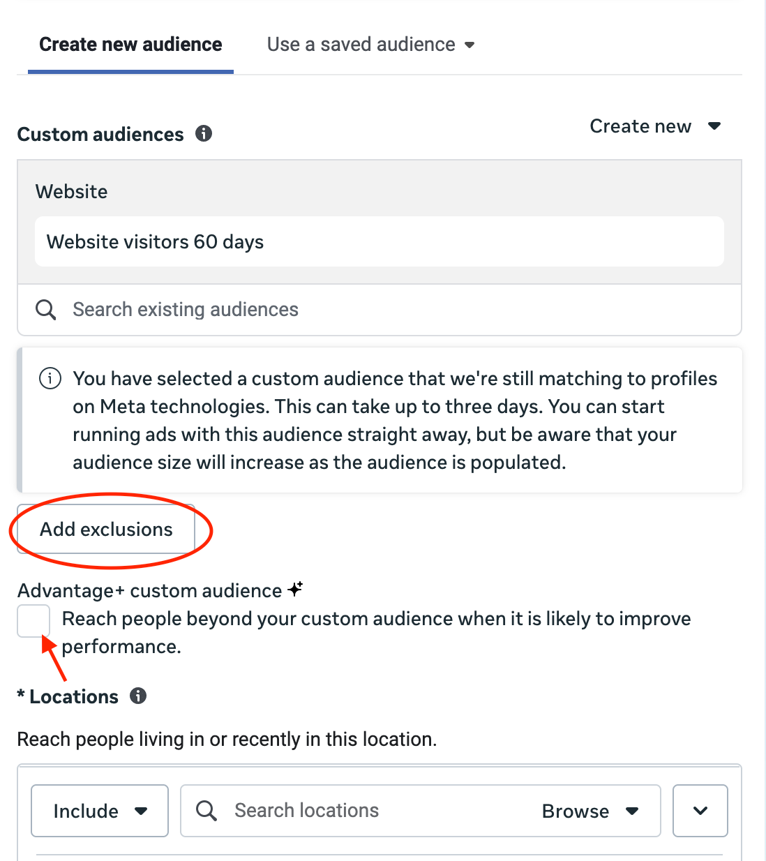 4. Fantastic! Now you've set the ad to include all your website visitors over the past 60 days, but exclude all your current customers. So the ad will just go to people who didn't commit, giving them a gentle reminder.